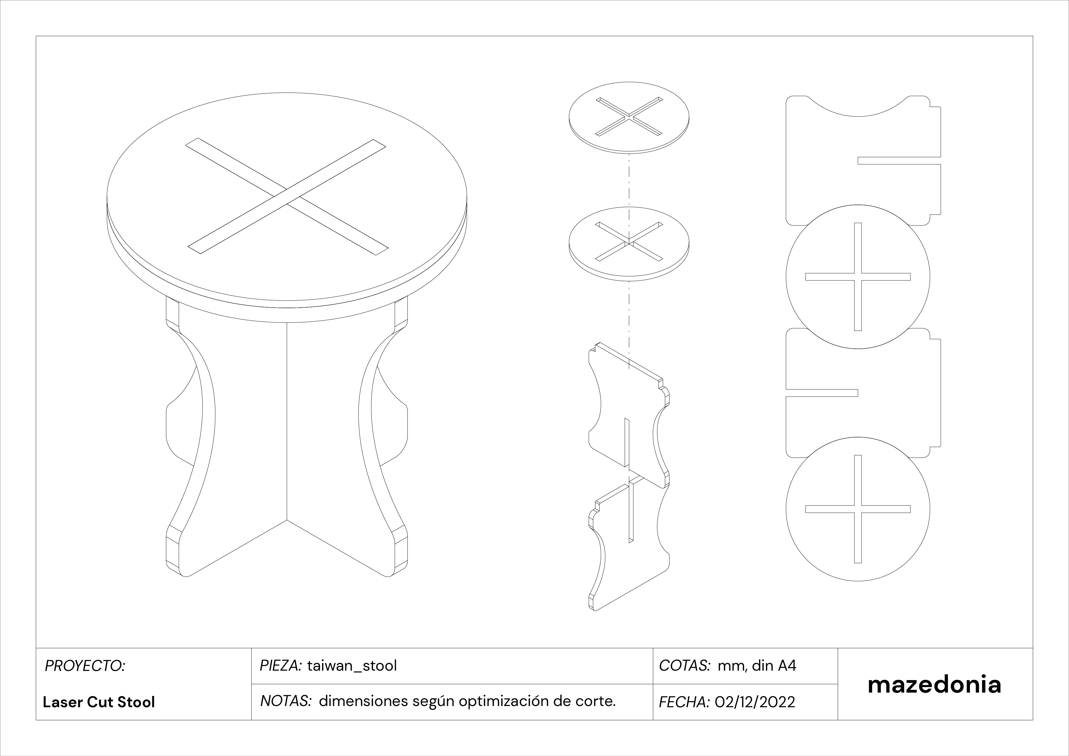 Mazedonia Design-en proposamena, taburete ttipia, denboraren lekuko isila. Bere eskala haurrentzat zein helduentzat egokia da. Egurra eta plastikoa konbinatzen dira, erraz desmuntatu eta garraiatu daiteke. Taburetearen plastikozko estalkia eta bildumaberdineko produktuak plastikozko xafla birziklatu beretik moztu dira, laser bidezko mozketa makina erabiliz.